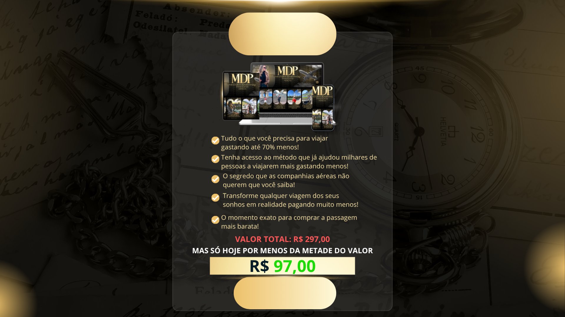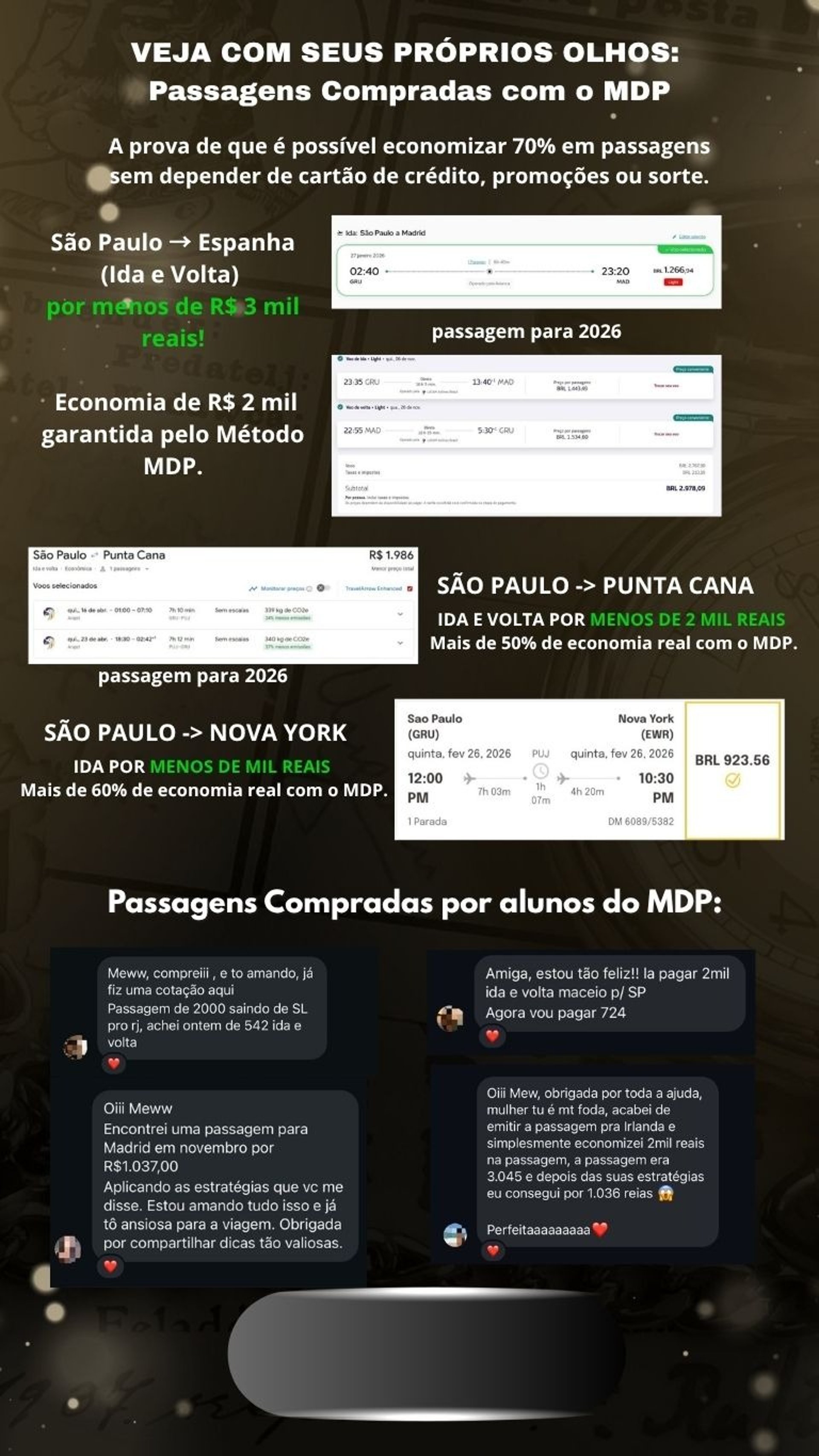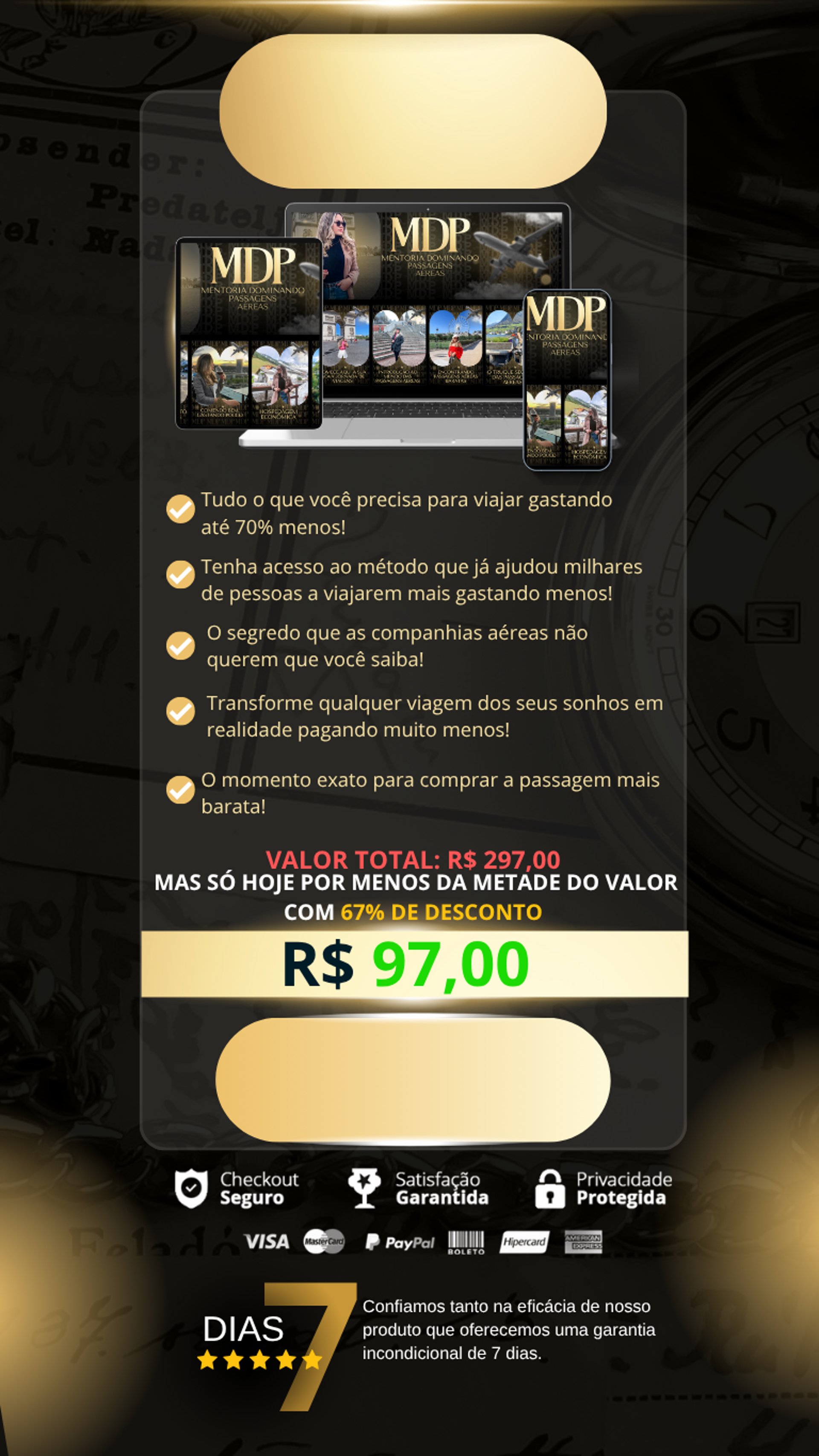 A Mentoria MDP é um método invisível e prático, que te mostra como desbloquear tarifas escondidas, evitar armadilhas das companhias aéreas e comprar passagens até 70% mais baratas.